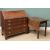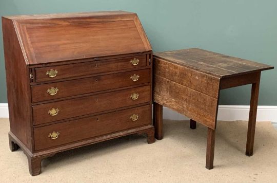 GEORGIAN STYLE MAHOGANY BUREAU having a fitted interior over a base of four drawers with brass drop handles, on bracket feet, 1112cms H, 107cms W, 56cms D and a single flap oak table, 77cms H, 94cms W (extended), 90cms D