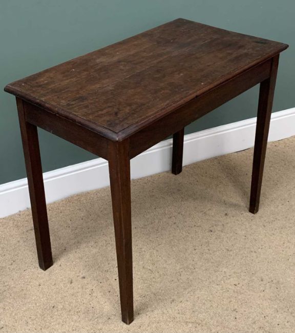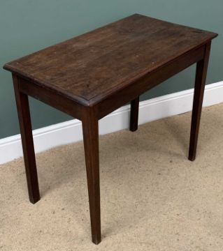 ANTIQUE MAHOGANY SIDE TABLE having a rectangular top on a turned pedestal, 72cms H, 59cms W, 35cms D and an oblong mahogany side table on tapered supports, 78cms H, 91cms W, 51cms D