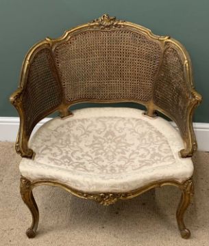 FRENCH STYLE FURNITURE comprising two gilt painted salon chairs, 95cms H, 48cms W, 38cms D and a similar style Bergere style elbow chair, 77cms H, 73cms W, 46cms D