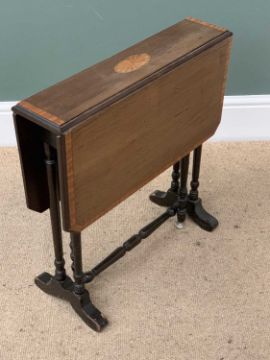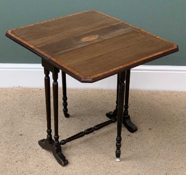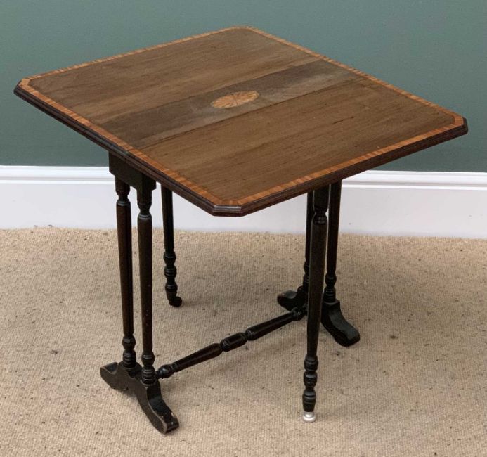 FURNITURE ASSORTMENT to include a Sutherland tea table with shell inlay detail, 57cms H, 56cms, 66cms D, a Victorian mahogany bedside table, 65cms H, 40cms W, 40cms D, a circular brass topped occasional table, 49cms H, 60cms diameter and a nest of three coffee tables, 49cms H, 56cms W, 33cms D the largest