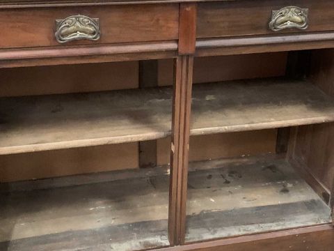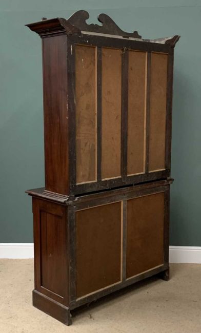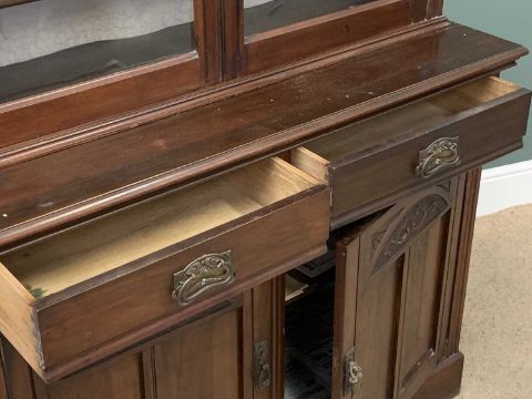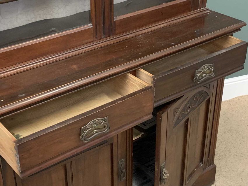 EDWARDIAN MAHOGANY BOOKCASE CUPBOARD, a fine example having upper twin glazed doors over a base section of two drawers and two cupboard doors with carved detail, 231cms H, 123cms W, 47cms D