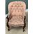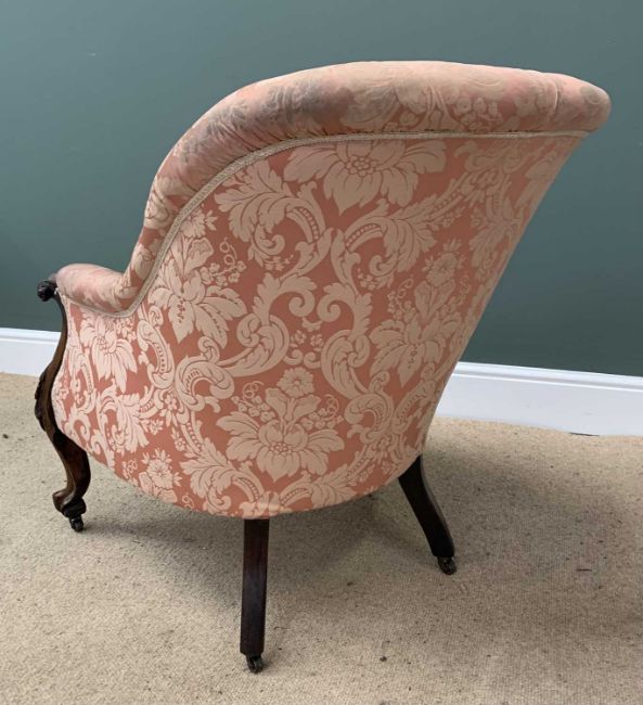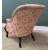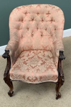 ANTIQUE SALON ARMCHAIR, button backed, pink upholstery with scrolled arms and feet, 89cms H, 70cms W, 52cms D