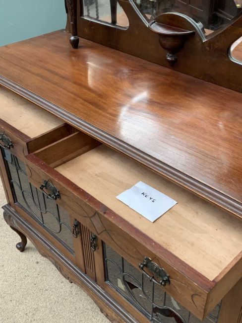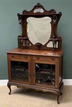 VICTORIAN MAHOGANY MIRROR BACK SIDE CABINET, the top with carved and scrolled outlines and bevelled glass mirror, the base with two drawers over two glazed cupboard doors, 206cms H, 122cms W, 46cms D