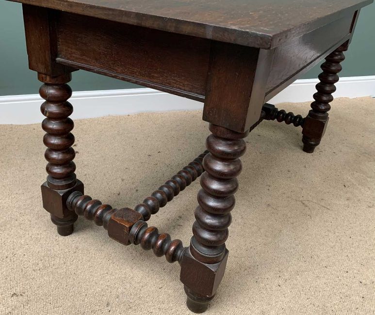 ANTIQUE OAK ALTAR TYPE TABLE on bobbin supports and stretcher, 77cms H, 143cms W, 70cms D