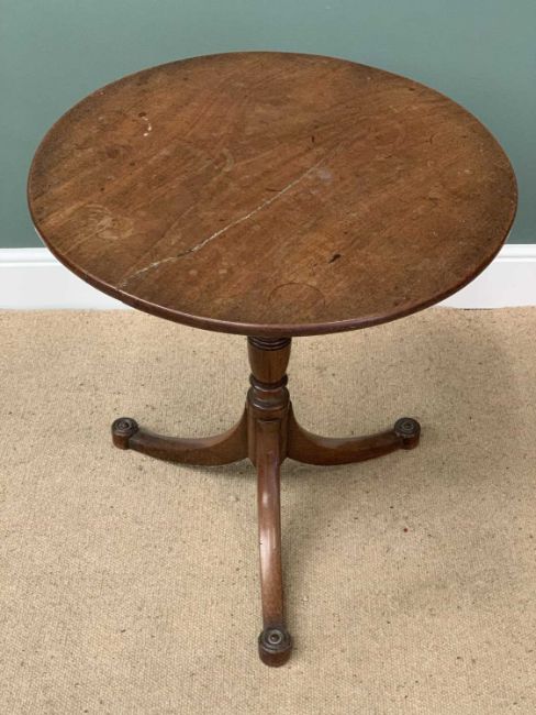 ANTIQUE OAK CIRCULAR TILT TOP TABLE on a tripod base, 57cms H, 80cms diameter and a similar taller table, 74cms H, 70cms diameter