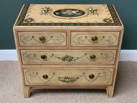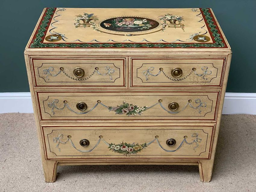 ANTIQUE PAINTED PINE CHEST of two short over two long drawers, with floral and garland decoration, 83cms H, 91cms W, 49cms D