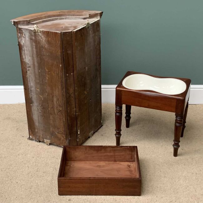 ANTIQUE FURNITURE (2) - an oak bow fronted, two door wall hanging corner cupboard, 87cms H, 60cms W, 38cms D and a mahogany commode on turned supports, 46cms H, 47cms W, 33cms D