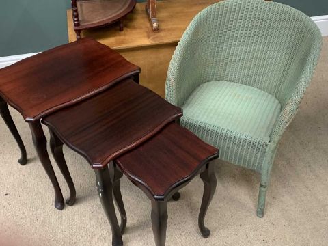 FURNITURE ASSORTMENT to include Lloyd Loom tub chair, towel airer, whatnot, blanket box and a nest of three reproduction tables