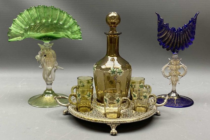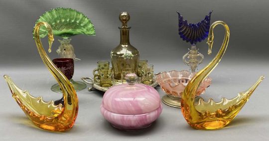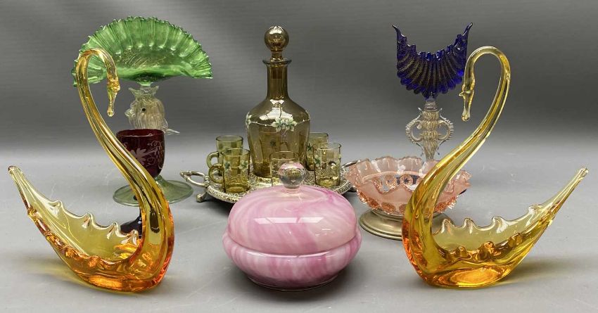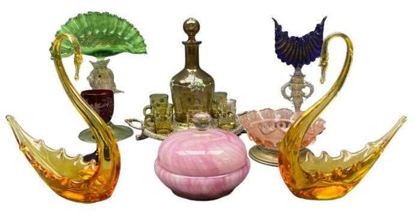 ANTIQUE GLASSWARE - a decorative parcel including Amber swans, decanter, taster tray and glasses, ETC