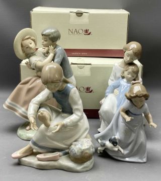 LLADRO FIGURE OF A YOUNG BOY & A GIRL EMBRACING - 25cms tall, two Nao figures and an unmarked similar figure