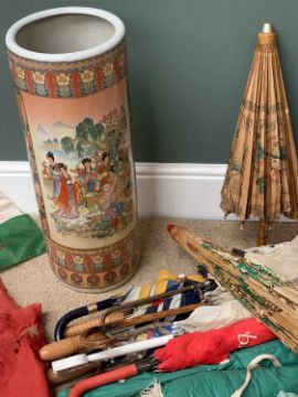 JAPANESE POTTERY STICKSTAND with quantity of vintage walking sticks, umbrellas, parasols and flags, 62cms H, 23cms diameter