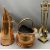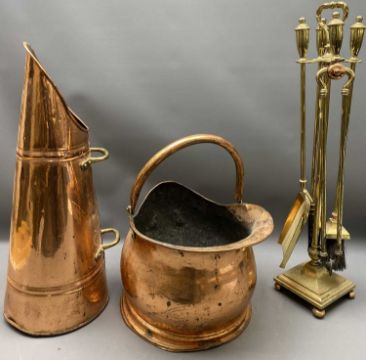 COPPER HELMET COAL SCUTTLE, a copper coal scuttle and a good set of brass fire irons on stand