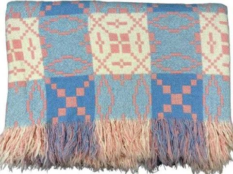 WELSH WOOLLEN BLANKET - with Derw label, traditional reversible pattern in pink and blue tones, 216 x 150cms