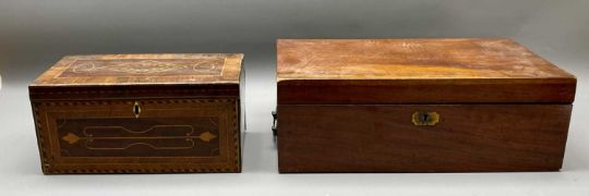 VICTORIAN MAHOGANY WRITING SLOPE - with side carry handles and a Regency inlaid and boxwood strung lidded box, 16cms H, 45cms W, 24.5cms D and 15.5cms H, 31cms W, 15cms D, measurements respectively