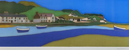 JAYNE HUSKISSON silks (2) - seaside villages, 23 x 60cms and a third entitled 'Aberfraw', 19 x 40cms, all signed in pencil and neatly framed