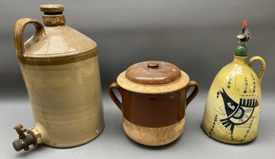 STONEWARE FLAGON WITH TAP, ceramic crock pot with lid and a Portugese flagon with stopper, the body with stylised decoration, 40cm, 25cm and 36cm heights respectively