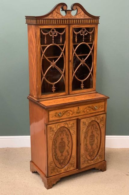 FRENCH STYLE INLAID SATINWOOD CABINET with twin glazed door upper section, the doors having ribbon and oval mouldings to ten panes over a base section of one central drawer with two cupboard doors below, profuse urn and swag multi wood inlays, labelled 'H A Comer, Shaftesbury Avenue, London', 178cms overall H, 75cms W, 43cms D