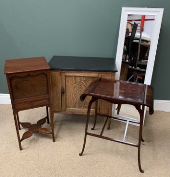 FURNITURE ASSORTMENT (4) to include an antique mahogany pot cupboard with lower drawer and lift top, 84cms H, 38cms W, 38cms D, a washstand with black marble top, 76cms H, 75cms W, 43cms D, a mahogany occasional table with shaped top, 69cms H, 60cms W, 38cms D and a modern dressing mirror, 135 x 43cms