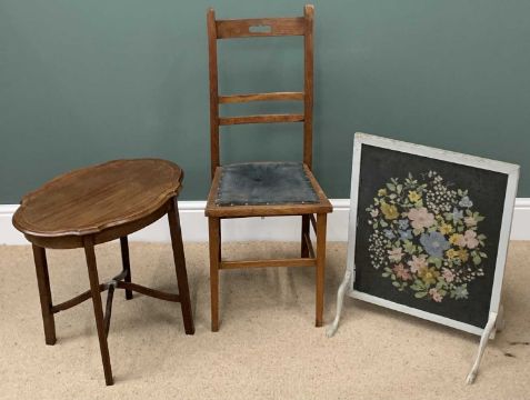 FURNITURE ASSORTMENT to include twin glazed door bookcase with two door base, 120cms H, 76cms W, 25cms D, oak gate leg tale, 73cms H, 105cms W, 151cms D (open), floral decorated firescreen, shaped top occasional table and a bedroom chair