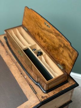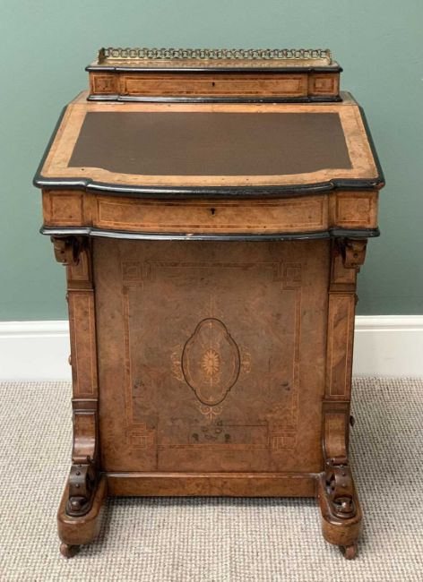 BURR WALNUT & EBONIZED DAVENPORT with four end drawers, galleried top with stationery compartment, 87cms H, 56cms W, 57cms D
