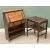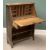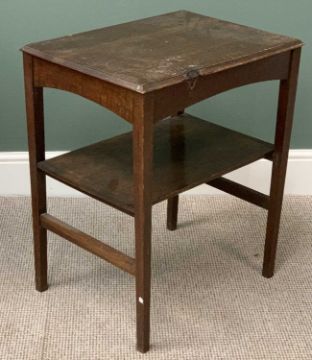 ARTS & CRAFTS STYLE OAK BUREAU with two base shelves and central drawer, label for "Aston & Son, Furniture Manufacturers", 102cms H, 76cms W, 31cms D and a two tier oblong topped occasional table, 73cms H, 62cms W, 46cms D