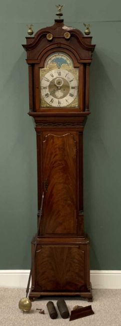 LONGCASE CLOCK by Harrison of Liverpool with rolling moon eight day movement, brass face and silvered dial, arched and pillared top with brass effect finials and mahogany trunk, 252cms H, 62cms W, 31cms D