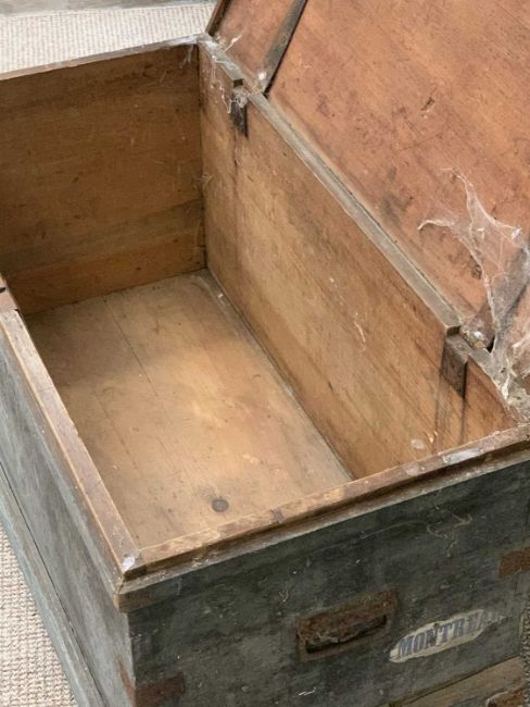 VINTAGE PINE CAMPAIGN TYPE CHEST with iron handles, 50cms H, 101cms W, 49cms D