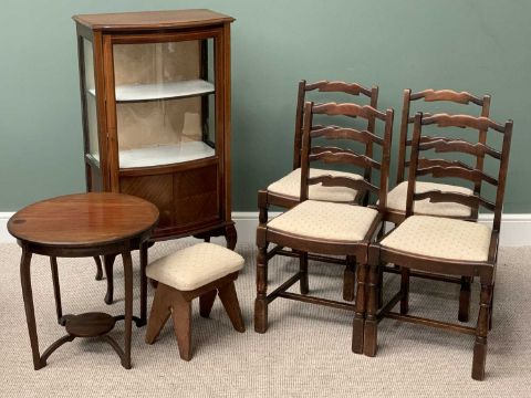 FURNITURE ASSORTMENT (4) - to include an Edwardian mahogany display cabinet on splayed supports, with bow front, 120cms H, 61cms W, 36cms D, a circular topped occasional table, four ladderback chairs and a rustic stool