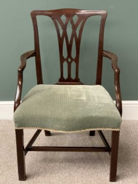 MAHOGANY DROP LEAF TABLE, 72cms H, 150cms W, 105cms D (open) and a Chippendale style splatback mahogany elbow chair, 94cms H, 62cms W, 48cms D
