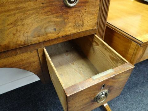 REGENCY MAHOGANY SECRETAIRE BOOKCASE, short cornice, fielded panel doors enclosing fixed shelves, secretaire drawer above 2 short drawers, reeded uprights, turned legs, 92w x 49d x 188cm h