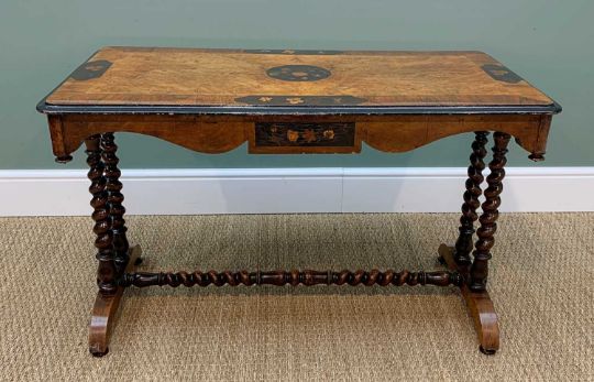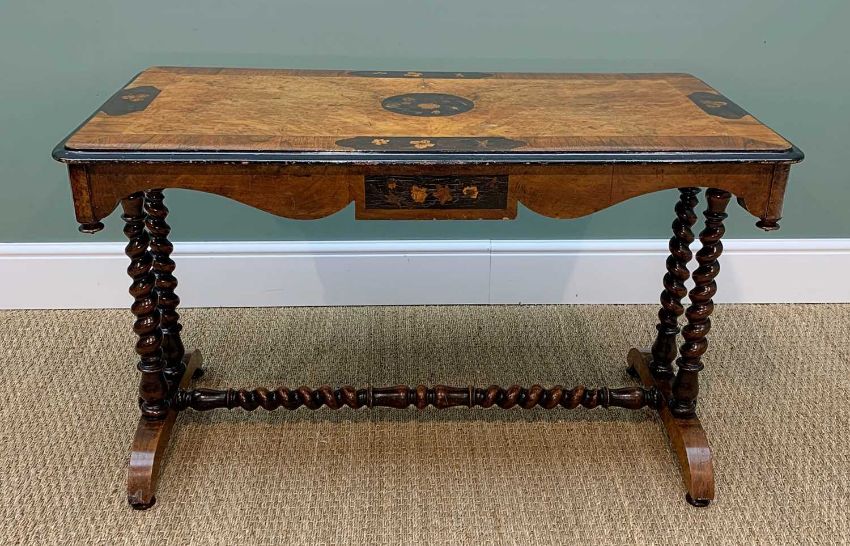 VICTORIAN WALNUT, ROSEWOOD & MARQUETRY CENTRE TABLE, moulded ebonised top, shaped frieze,baluster legs & stretchers, 106.5w x 55d x 66cm h