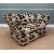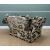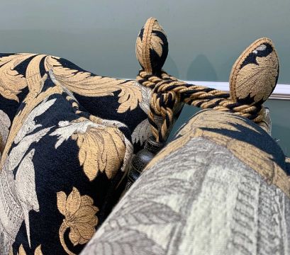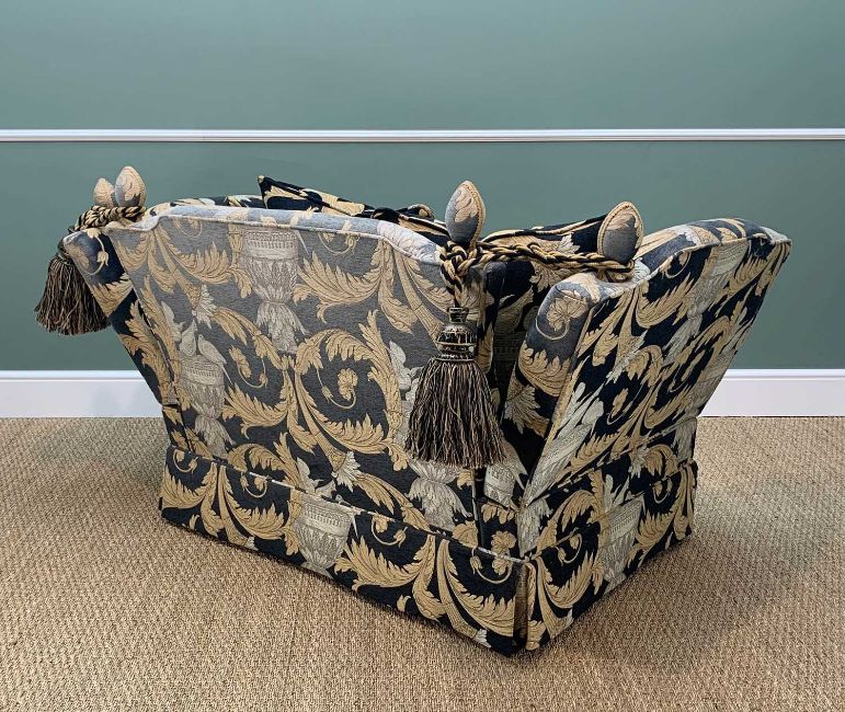 TWO LARGE KNOLE SOFAS, upholstered in black, gold and ivory classical styled fabric, large wood tassels, comprising four seater sofa and large single seater sofa (2)Comments: rear of small sofa faded