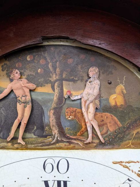 EARLY 19TH CENTURY WELSH AUTOMATA LONGCASE CLOCK, c. 1835, James George, Fishguard, painted 11 1/2in. dial with automata Adam & Eve beside tree of life in the garden of Eden painted in the arch, subsid. seconds dial and calendar aperture, hood with swan neck pediment, dentil frieze, inlaid Prince of Wales feathers ovals, shaped door, fluted canted angles, crossbanded base with quadrant spandrels, putti moulded pendulum bob, 228cms h.Provenance: private collection Swanseaold repairs to case, dial with restored paint chips to perimeter, base with old splits, movement restored 2006. Automaton action Eve offers Adam an apple with her outstretched arm.