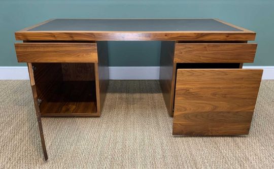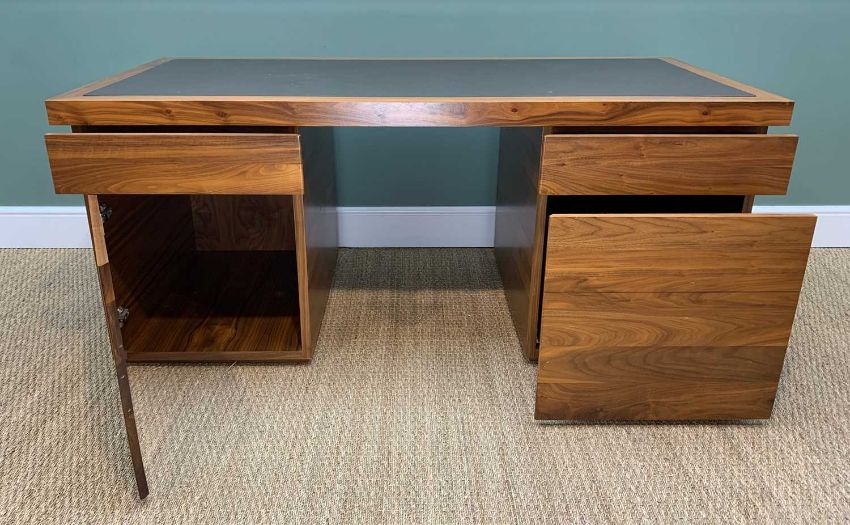 CONTEMPORARY WALNUT PEDESTAL DESK, inset brown leather top upon banks of drawers and filing drawer, 175 x 81cm