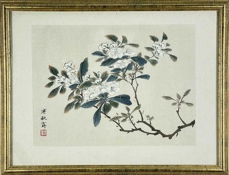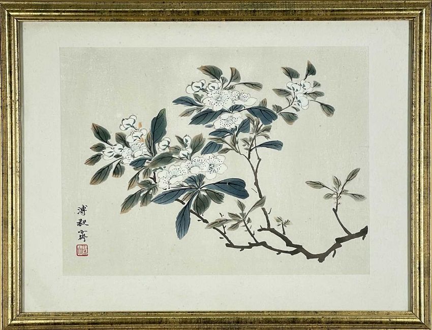 FOUR CHINESE PAINTINGS, ink and wash on silk or paper - maidens in a small boat 17.5 x 21.5cm, pilgrim on horseback with attendant approaching a mountainous temple 19 x 21cm, white prunus blossom 24 x 33cm, scroll painting of a Horse after Xu Heihong dated 1978 (3)