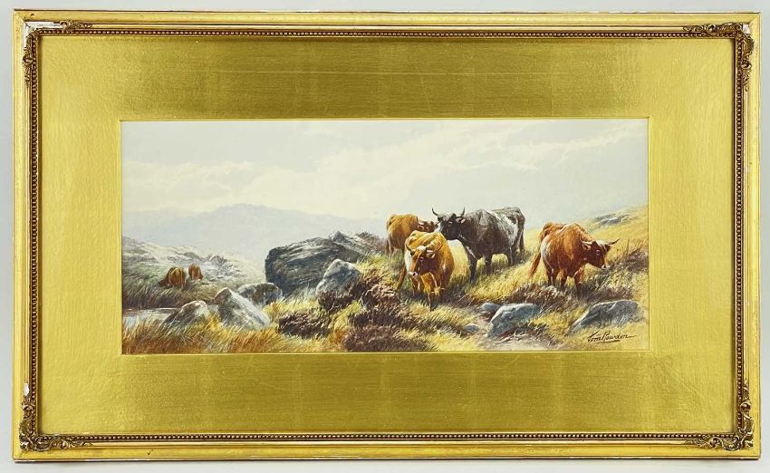 TOM ROWDEN (1842-1926), watercolour - Cattle grazing on Dartmoor, and a companion, signed, 20.5 x 46.5cm (a pair)