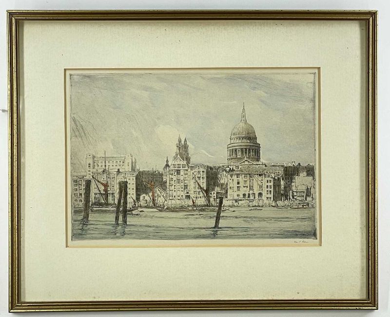 WILLIAM PALMER ROBINS (1882-1959) etching with colour - St. Pauls cathedral from the Thames, signed in pencil, 20 x 30cm