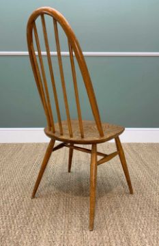 ERCOL ELM DINING TABLE & FOUR DINING CHAIRS, table model '384' with drop flap sides, 113cm w, chairs model '365' Windsor 'Quaker' design (5)