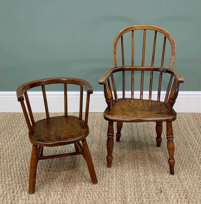TWO ANTIQUE CHILD'S COUNTRY CHAIRS, including an elm Windsor chair, 70cms high (2)