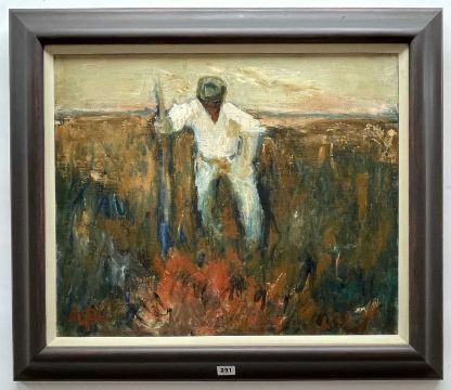 WILL ROBERTS oil on canvas - single figure entitled 'Burning Stubble', signed with initials and verso with date 1994