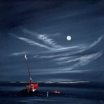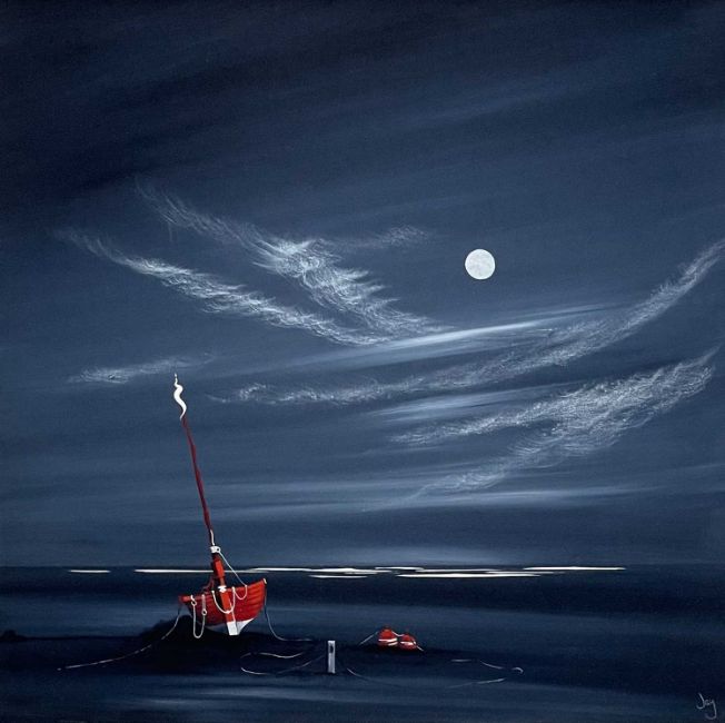 JAY NOTTINGHAM acrylic on board - moonlit coastal scene with red boat, signed