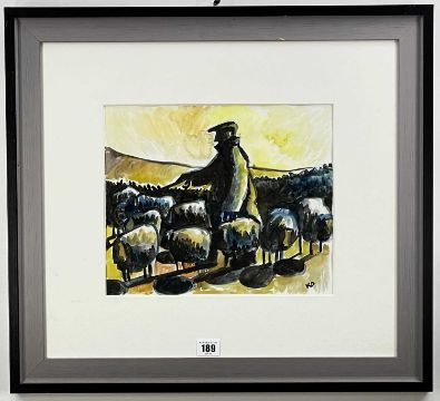 KARL DAVIES watercolour - shepherd and flock, signed with initials, dated verso 2008