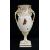 RARE SWANSEA PORCELAIN TWIN-HANDLED VASE circa 1815-1817, in the French-Empire style, of slender ovoid form with round pedestal base to a square plinth, complex moulded handles having fan terminals and floral medallions, London painted with an extensive Continental scene of three standing figures conversing in moonlight upon headland above a fortified port, the reverse with large butterfly and three smaller insects, pink roses painted to neck and foot, fine gilding to all sections including foliate band below neck and above stem