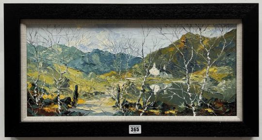 CHARLES WYATT WARREN oil on board - Eryri mountain landscape with lake, whitewashed cottage and silver birch trees, signed