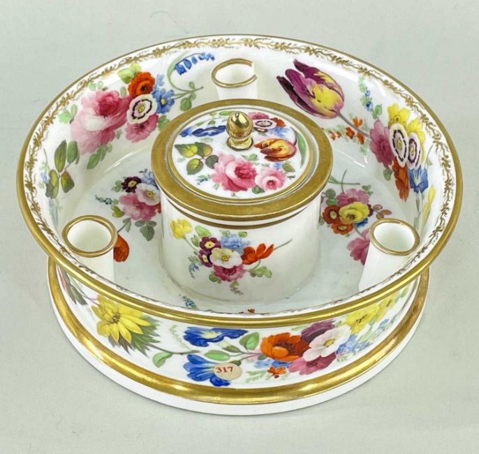 RARE SWANSEA PORCELAIN INKSTAND circa 1815, having a shallow cylinder bowl with everted rim, centre cylinder ink-pot complete with liner and fitted cover having bud finial, three tapered pen holders applied to interior wall, decorated with sprays of colourful flowers, circling gold fruit vine and gold rims, Swansea script mark to baseDimensions: 14cms diamProvenance:consigned by the family of preeminent Welsh porcelain collector Sir Leslie Joseph. Sir Leslie's 1969 label to underside for loan to Glynn Vivian Gallery, Swansea, also label for well-known porcelain collector Harry Sherman, very same inkstand illustrated p.154 'Swansea Porcelain: Shapes and Decoration' by AE (Jimmy) Jones and Sir Leslie Joseph (1988)Condition Report:repair to finial, small faint hairline to body, chip to one pen-aperture