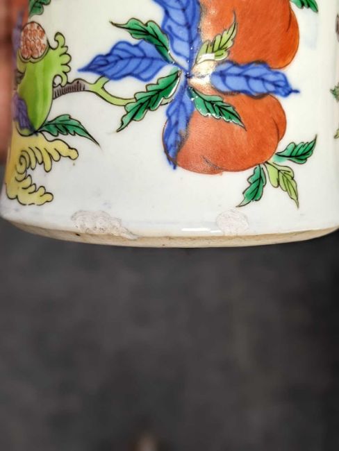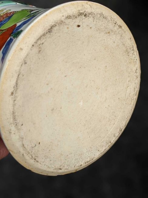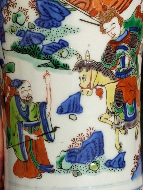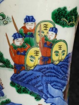 CHINESE WUCAI PORCELAIN GU SHAPED VASE, Transitional style but later, painted with three registers depicting soldiers and travelling monks, flowering rockwork, and the 'three abundances' (fu shou san duo), unglazed base