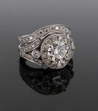 MODERN PLATINUM DIAMOND ENCRUSTED ENGAGEMENT RING & MATCHING WEDDING BAND, the central stone measuring 1.5cts approx. (visual estimate), surrounded by a row of thirteen diamonds, and a further thirty diamonds set to the shoulders, the shaped wedding band set with sixteen diamonds, ring size I / J, personalised engraving to shank, 12.6gms gross (2)