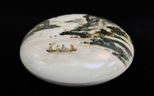 CHINESE PORCELAIN BOX & COVER ATTRIBUTED TO WANG YETING (JNR), People's Republic, both cover and base painted in the Qianjiang style with a river landscape with four figures in a boat, others on a rocky outcrop, both signed, base with red symbol