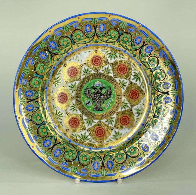 RUSSIAN PORCELAIN DESSERT PLATE FROM THE KREMLIN SERVICE, Imperial Porcelain Factory, St. Petersburg, period of Nicholas I, cavetto painted with stylized blossoms on gilt ground with foliate sprays at intervals around the Imperial double-headed eagle and the Russian title of Emperor Nicholas I ('Emperor and Autocrat of All the Russias'), the borders with floral and foliate sprays on gilt ground, marked on underside with crowned monogram of Nicholas I, inscribed 'OXP 21802', Leslie Joseph collection label no. 169