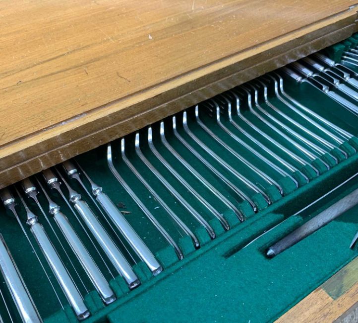 1930'S TWO DRAWER SATIN WALNUT CANTEEN OF PLATE CUTLERY, Joseph Rogers & Sons Limited, tables containing almost complete electroplated table service for eight table settings, 76h x 68w x 39cmsComments: 1 fruit knife missing only
